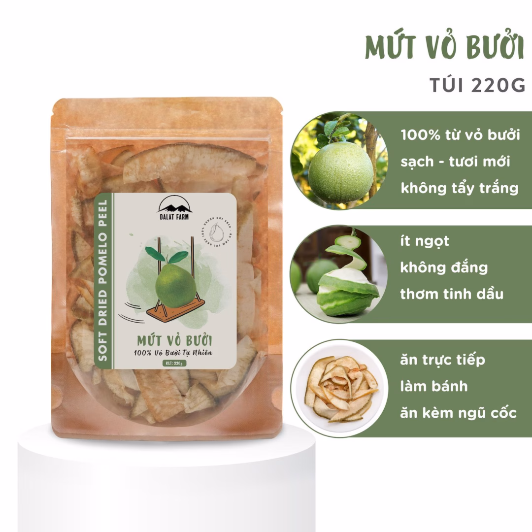 - Nguyên liệu: 100% vỏ bưởi non, không chứa chất phụ gia hay màu thực phẩm nhân tạo.