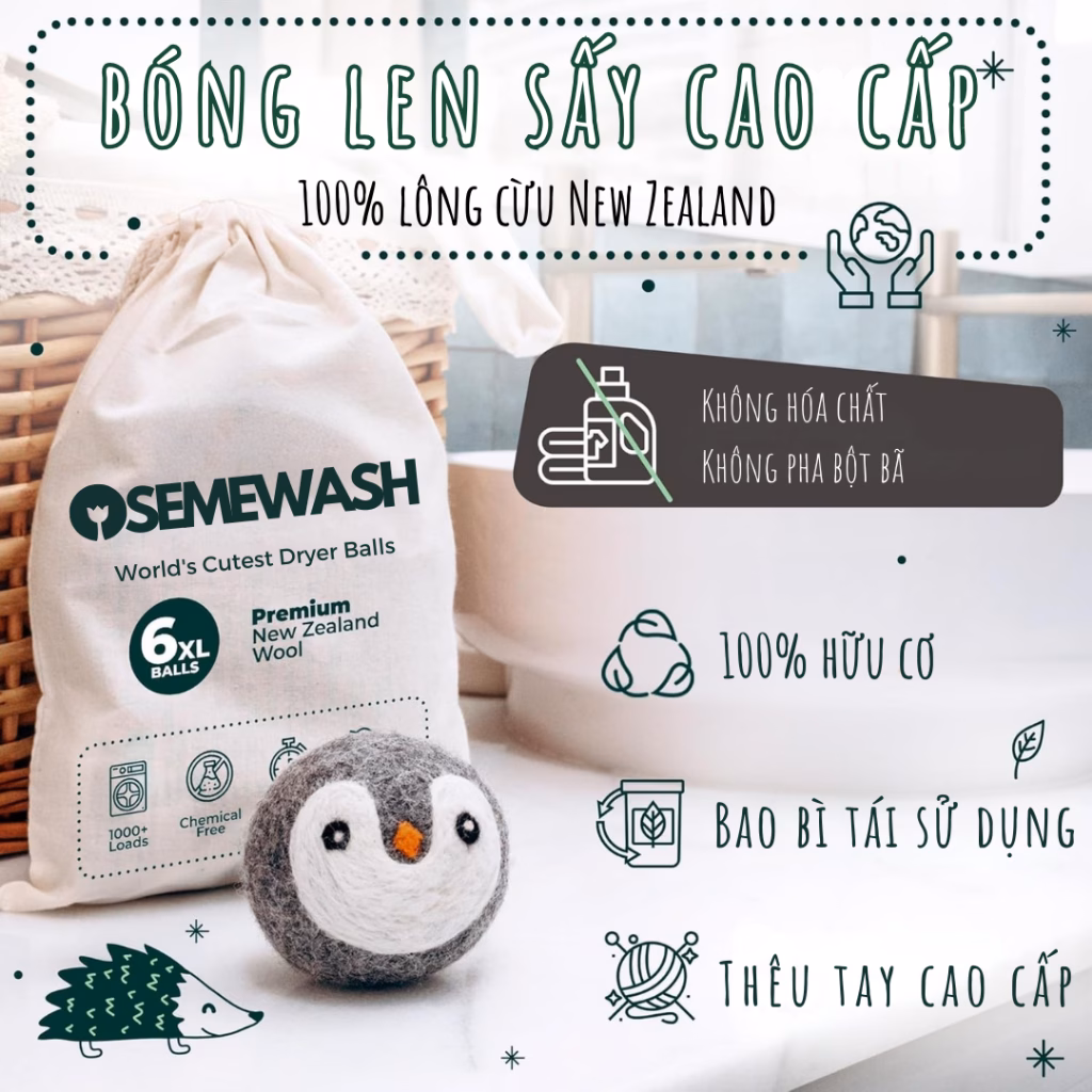 Bóng sấy quần áo len hữu cơ chống nhăn Semewash dryer ball được làm từ lông cừu New Zealand, là một lựa chọn tuyệt vời cho những người muốn giữ cho quần áo len của mình luôn mềm mại và bền đẹp. Sản phẩm này không chỉ giúp giảm thiểu nhăn mà còn giúp quần áo len khô nhanh hơn và tiết kiệm năng lượng.