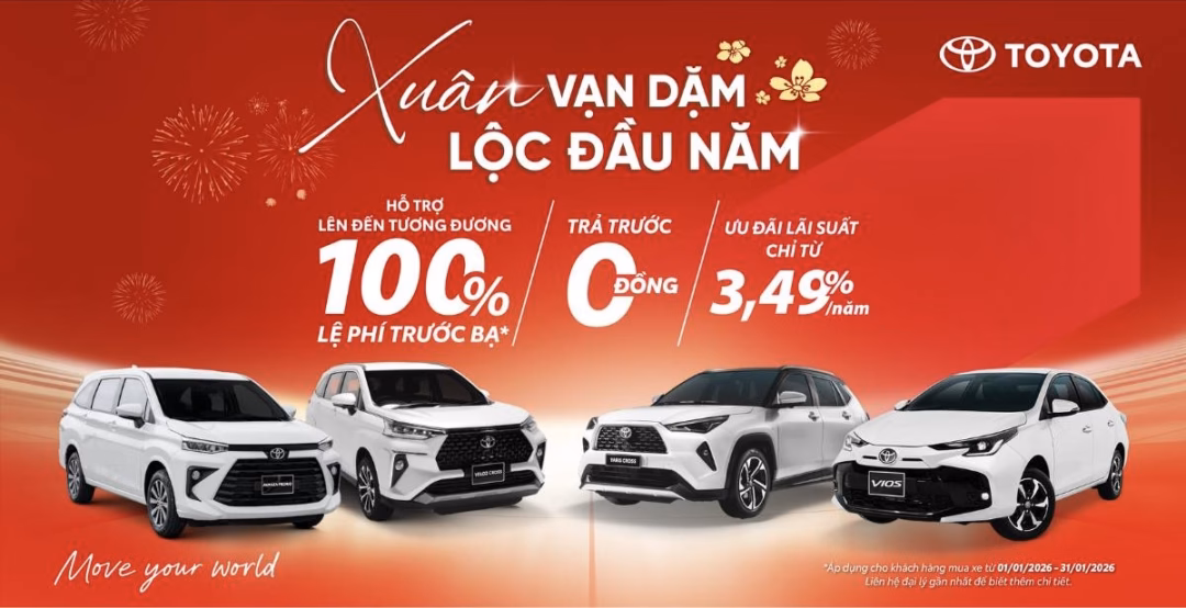Toyota Việt Nam vừa công bố loạt ưu đãi đặc biệt cho khách hàng mua xe mới trong suốt tháng 1/2026, bao gồm khuyến mại, ưu đãi tài chính và chương trình bảo hành kéo dài tới 10 năm.